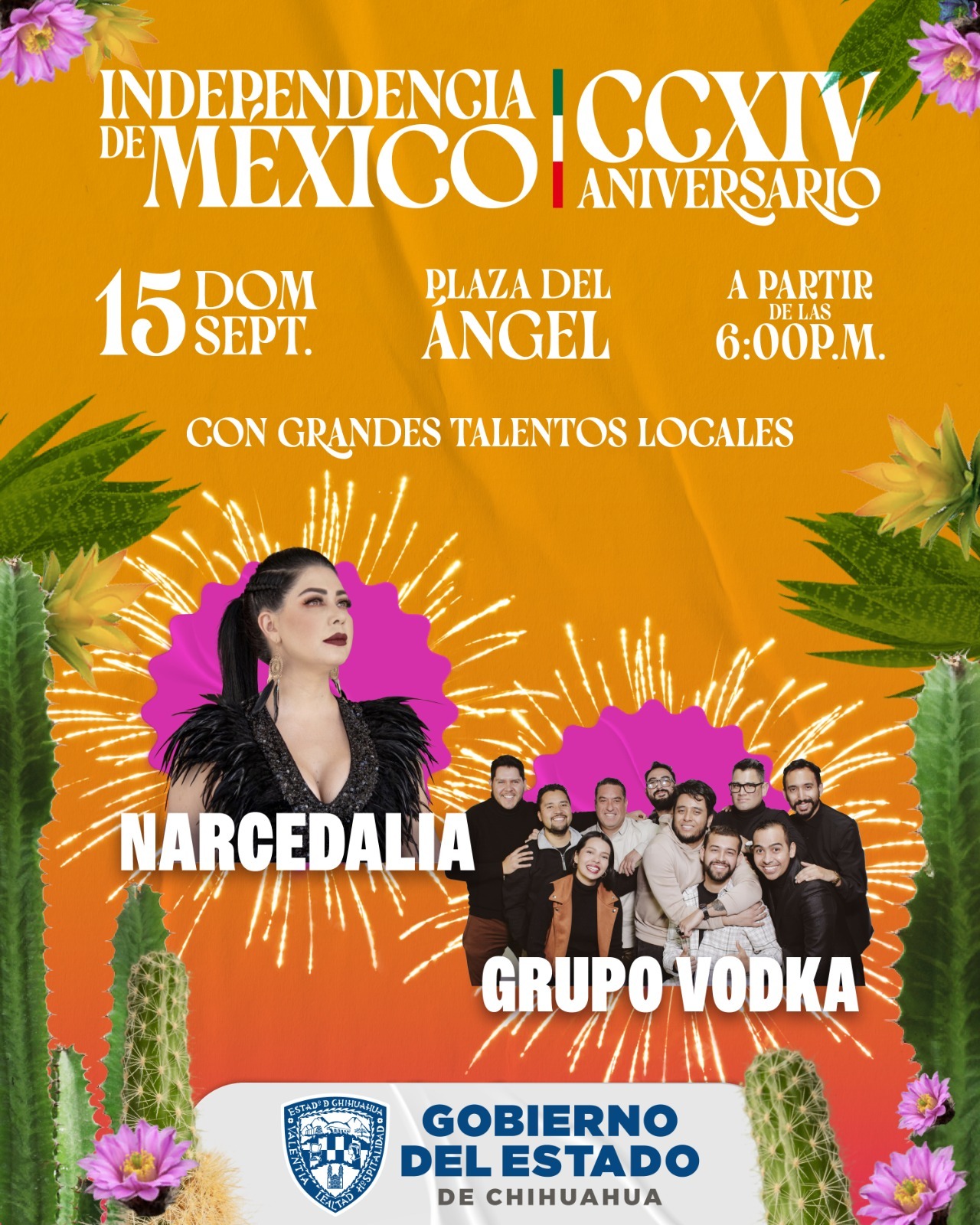 En el marco de la celebración del 214 aniversario del Grito de Independencia, el Gobierno del Estado invita a las y los chihuahuenses a participar en la gran fiesta que se llevará a cabo en la Plaza del Ángel a cargo de artistas locales y nacionales, junto con un mega show de pirotecnia.