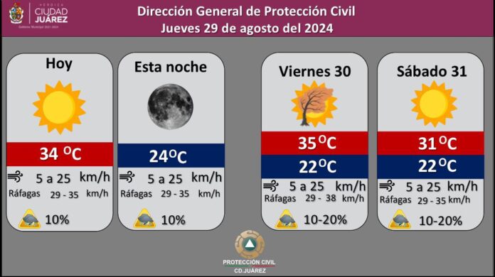 La Dirección de Protección Civil informa que para hoy jueves se espera un cielo parcialmente nublado, con temperatura máxima de 34 grados Centígrados y mínima de 24 grados.