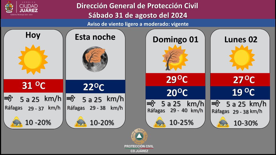 Se espera que el viento oscile entre los 5 y 25 kilómetros por hora, con posibilidad de ráfagas de viento que alcancen una velocidad de entre 29 y 38 kilómetros y la posibilidad de lluvias o tormentas eléctricas es del 10 al 20 por ciento.