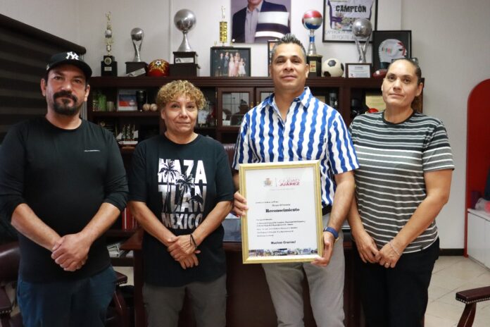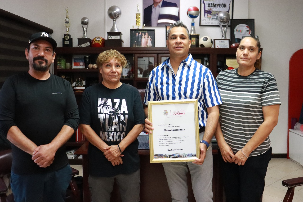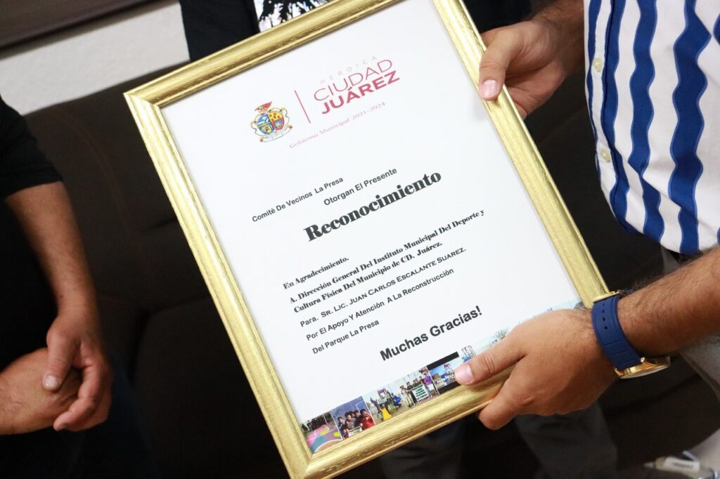 El director del Instituto Municipal del Deporte y Cultura Física de Juárez (IMDEJ), Juan Escalante, recibió un reconocimiento por parte del Comité de Vecinos de la colonia La Presa.