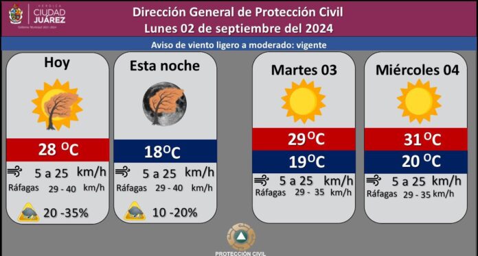 Se espera que el viento oscile entre los 5 y 25 kilómetros por hora, con posibilidad de ráfagas que alcancen una velocidad de entre 29 y 40 kilómetros; la posibilidad de lluvias o tormentas eléctricas es del 20 a 35 por ciento.