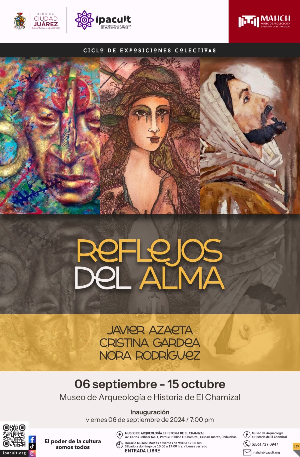 El Instituto para la Cultura del Municipio de Juárez (IPACULT) invita a la ciudadanía a la inauguración de la exhibición “Reflejos del Alma: Ciclo de Exposiciones Colectivas,” el próximo viernes 6 en el Museo de Arqueología e Historia de El Chamizal (MACHC).