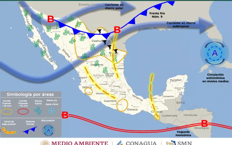 Para este martes, el monzón mexicano en interacción con el frente frío número 1 sobre la frontera norte y noreste, un canal de baja presión y el ingreso de humedad procedente del Océano Pacifico y Golfo de México, favorecerán ambiente de templado a cálido por la mañana, de poco caluroso a caluroso por la tarde, temperaturas de frías a frescas en la zona serrana, cielo de mayormente despejado a parcialmente nublado.