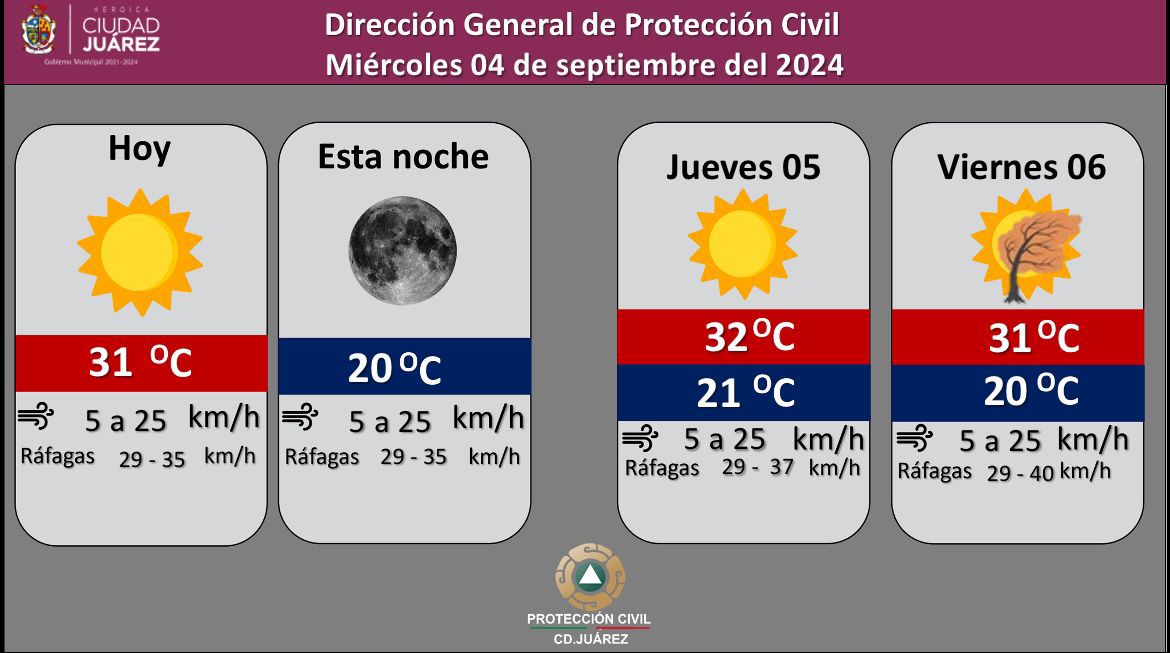 Se espera que el viento oscile entre los 5 y 25 kilómetros por hora, con posibilidad de ráfagas que alcancen una velocidad de entre 29 y 35 kilómetros; la posibilidad de lluvias o tormentas eléctricas es de 10 por ciento.