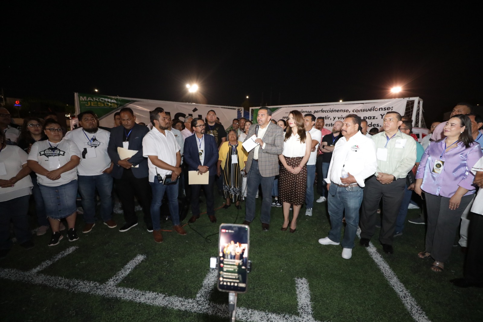 Esta noche, el alcalde, Cruz Pérez Cuéllar, en compañía de su esposa, la presidenta del Desarrollo Integral de la Familia (DIF), Rubí Enríquez, acudieron al evento, Clamor por Juárez, efectuado en el Estadio 20 de Noviembre, ubicado en la calle Ignacio Ramírez, en la colonia, Partido Romero.