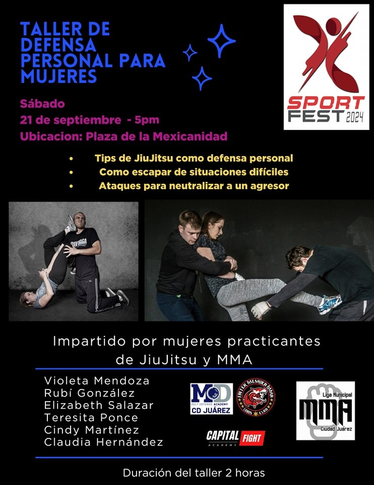 Como parte del Sport Fest 2024, un grupo de seis atletas juarenses practicantes de Jiu Jitsu y MMA estarán impartiendo un taller de defensa personal para mujeres mayores de 15 años de edad, con el objetivo de salvaguardar su integridad física.