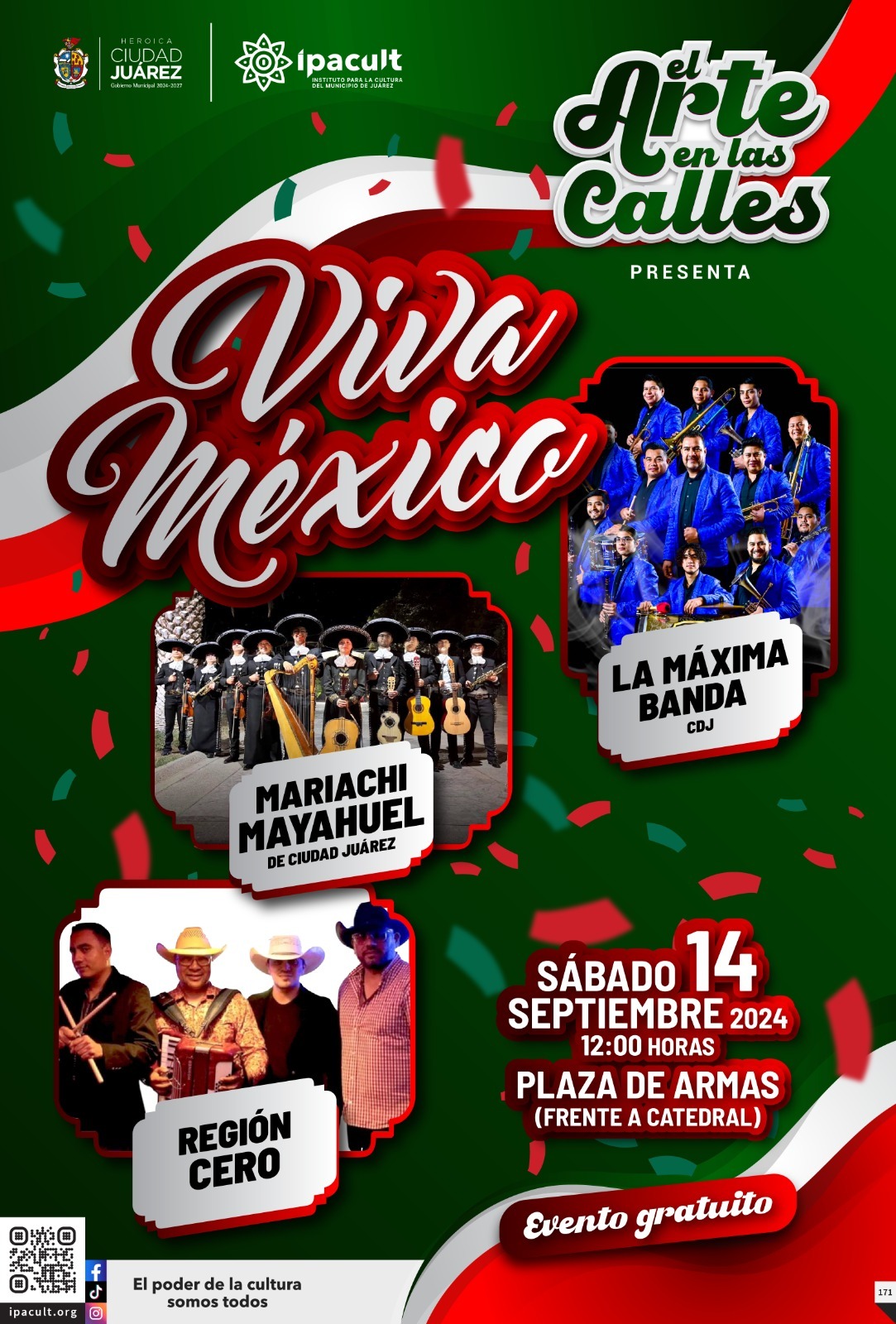 El Instituto para la Cultura del Municipio de Juárez (IPACULT), a través de su programa “Arte en las Calles”, invita a la ciudadanía a disfrutar del espectáculo “Viva México”, que se llevará a cabo el próximo sábado 14 de septiembre en la Plaza de Armas del Centro Histórico.
