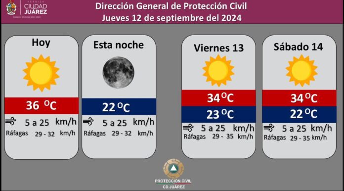 La Dirección de Protección Civil informa que para hoy jueves se espera un cielo despejado, con temperatura máxima de 36 grados Centígrados y mínima de 22 grados.