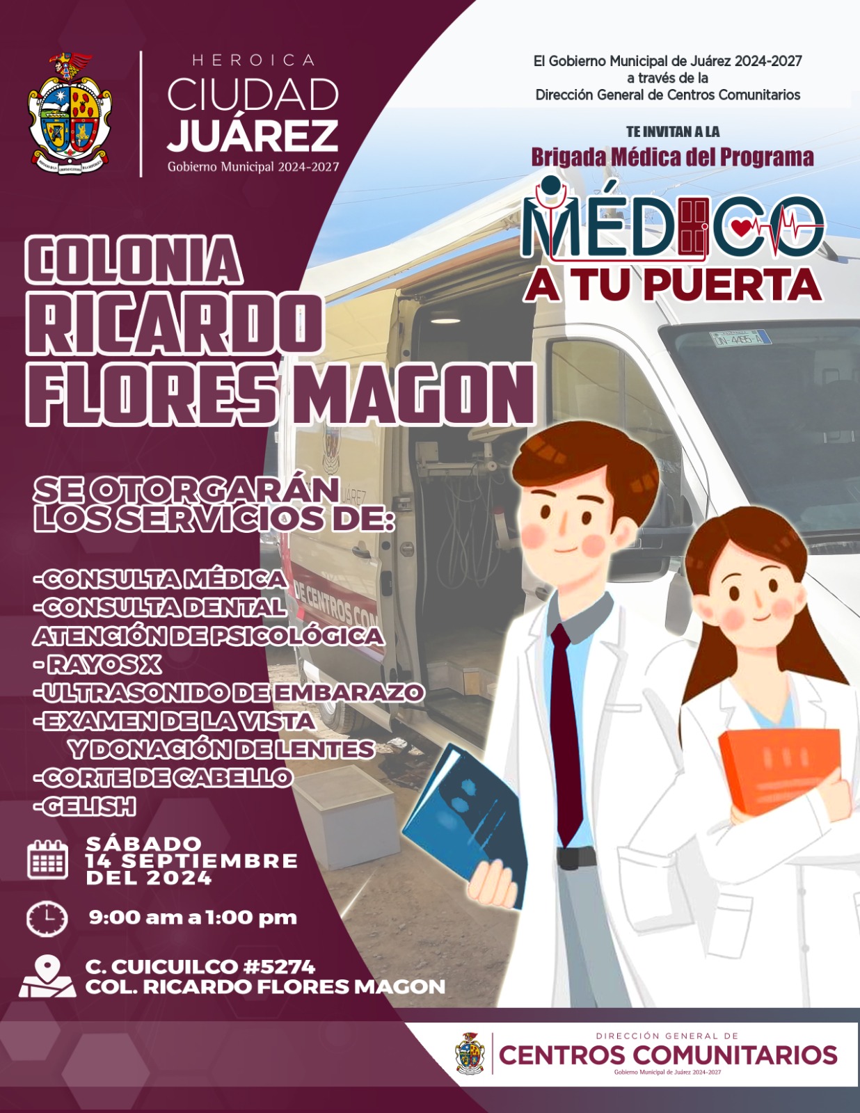 El Gobierno Municipal, a través de la Dirección General de Centros Comunitarios, invita a la comunidad de la colonia Ricardo Flores Magón a participar en la brigada del programa Médico a tu Puerta, actividad que se llevará a cabo mañana sábado 14 de septiembre.