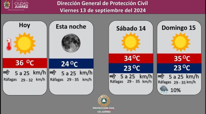 La Dirección de Protección Civil informa que para hoy viernes se pronostica un cielo despejado, con temperatura máxima de 36 grados Centígrados y mínima de 24 grados.