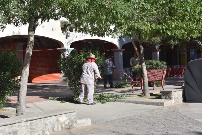 Como parte del programa para mejorar el entorno de la ciudad, personal de la Dirección de Parques y Jardines llevó a cabo labores de limpieza y mantenimiento en la Plaza Germán Valdés Tin Tan, ubicada en el cruce de la avenida 16 de Septiembre y calle Agustín Melgar.