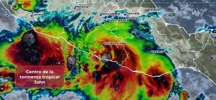 John ahora como tormenta tropical, se localiza en tierra en el estado de Guerrero, con desplazamiento hacia el noroeste. Producirá lluvias intensas a puntuales extraordinarias en Guerrero, Oaxaca, Chiapas, Veracruz, Michoacán y Puebla, así como chubascos con lluvias puntuales fuertes en el centro del país, incluido el valle de México.
