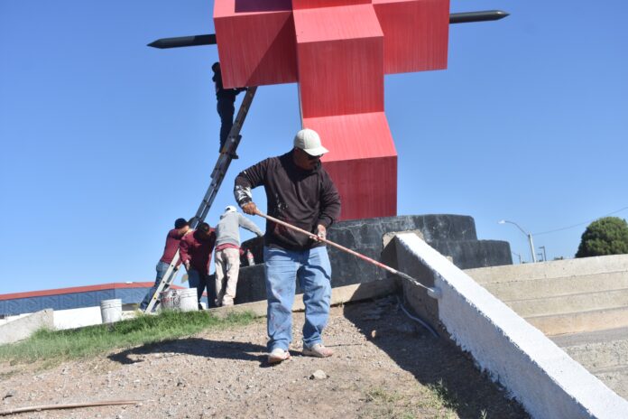 “Esta escultura es representada por varios cubos rojos y una paloma en la parte superior, por lo que las cuadrillas utilizaron pintura roja, blanca y negra para su debida rehabilitación”, dijo.
