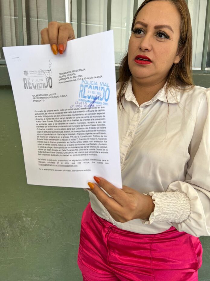 Hoy por la mañana Edith Escárcega entregó un oficio en las instalaciones de la Policía Vial, en el que se solicita su devolución al municipio, esto luego de que el H. Cabildo dictaminó el regreso de la Policía Vial sin porte de arma, con el objetivo de orientar a los automovilistas y ayudar en la prevención de accidentes. Así mismo se solicitó se permita la entrada al personal municipal a dicha área; sin embargo, el oficial estatal que atendió a la presidenta y secretario municipal que acudieron a hacer entrega de los documentos, los hizo esperar afuera a que les entregara el acuse de recibo, sin la mínima cortesía de atenderlos en el interior del inmueble.