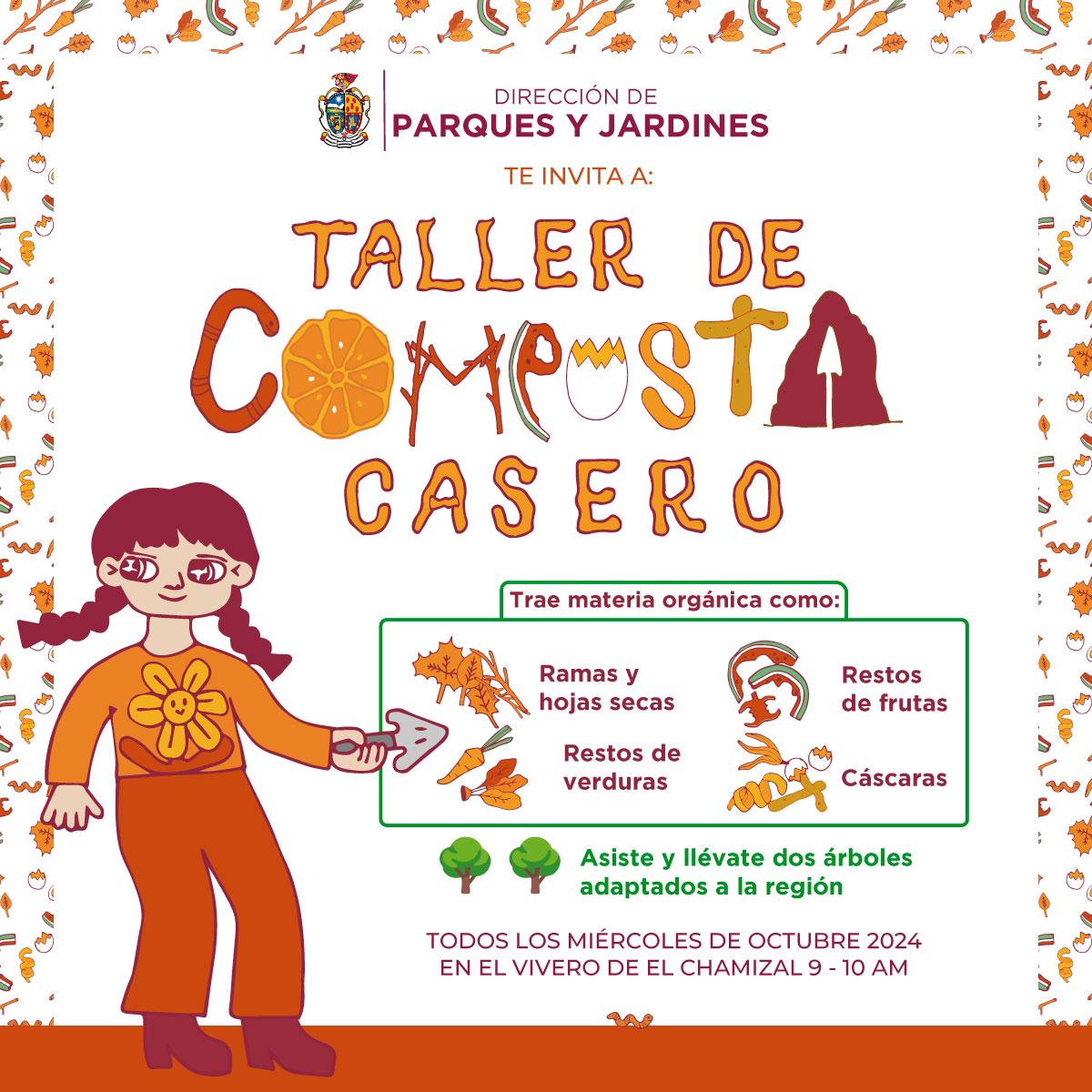 La Dirección de Parques y Jardines invita a la ciudadanía a asistir a los talleres de composta que se impartirán a partir del 9 de octubre en el vivero de El Chamizal, de 9:00 a 10:00 horas, dio a conocer Daniel Iván Zamarrón Saldaña, encargado de despacho de la dependencia.