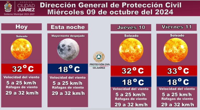 Hoy miércoles 9 de octubre se espera un día soleado con una temperatura máxima de 32° Centígrados, con vientos que tendrán una velocidad de entre 5 y 25 kilómetros por hora, con ráfagas de hasta 32 kilómetros por hora.