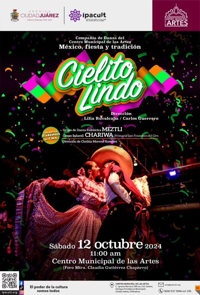 El Instituto para la Cultura del Municipio de Juárez (IPACULT) invita a toda la comunidad a disfrutar del espectáculo de danza “Cielito Lindo”, que se llevará a cabo este sábado 12 de octubre a las 11:00 de la mañana en el foro “Claudia Gutiérrez” del Centro Municipal de las Artes (CMA), la entrada es gratuita.