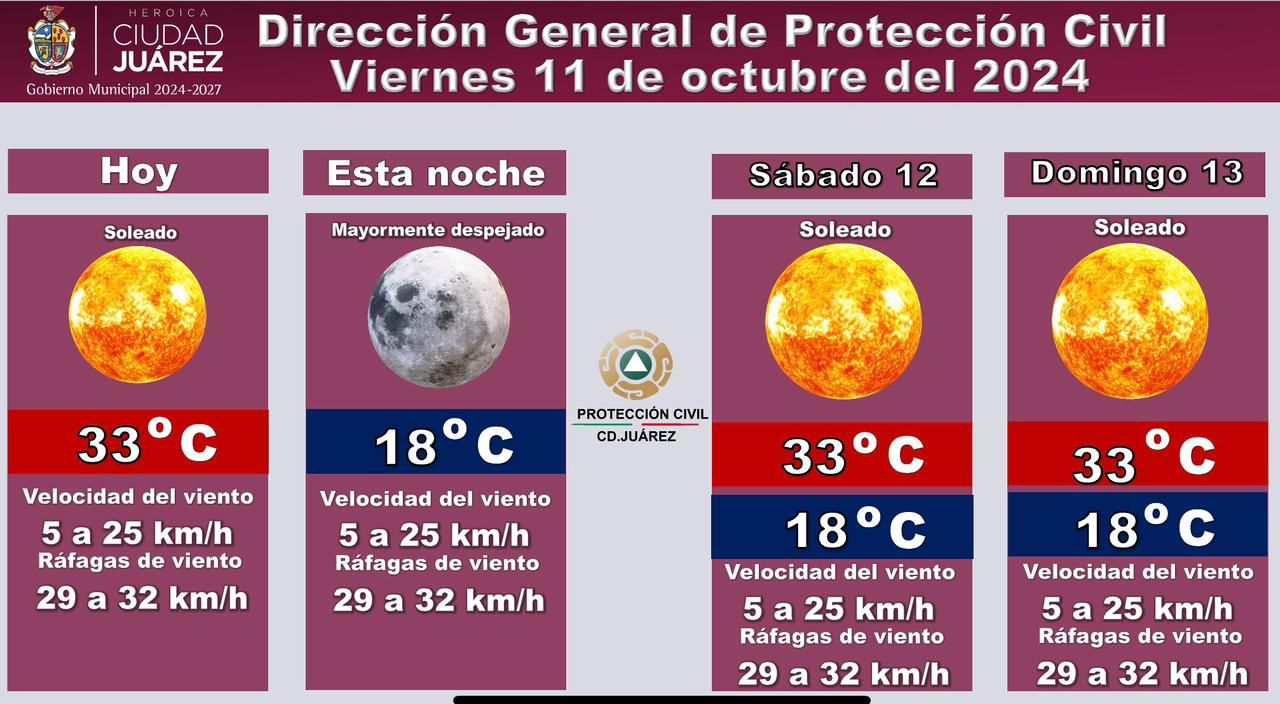 La Dirección General de Protección Civil informa el pronóstico del clima para este fin de semana, comenzando con hoy viernes 11, que se espera un día soleado con una temperatura máxima de 33°C, acompañada de vientos de 5 a 25 kilómetros por hora con ráfagas que podrían alcanzar los 32 kilómetros por hora.
