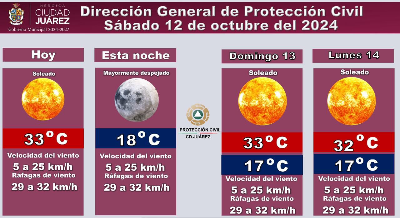 La Dirección General de Protección Civil de Ciudad Juárez ha emitido el pronóstico del tiempo para los próximos días, comenzando este sábado 12 de octubre de 2024:
