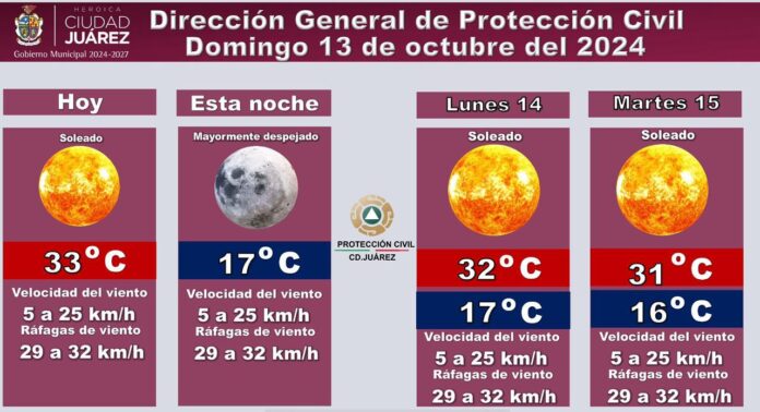 Ciudad Juárez se mantendrá con temperaturas cálidas durante los próximos días, según el reporte de la Dirección General de Protección Civil para el domingo 13 de octubre de 2024.