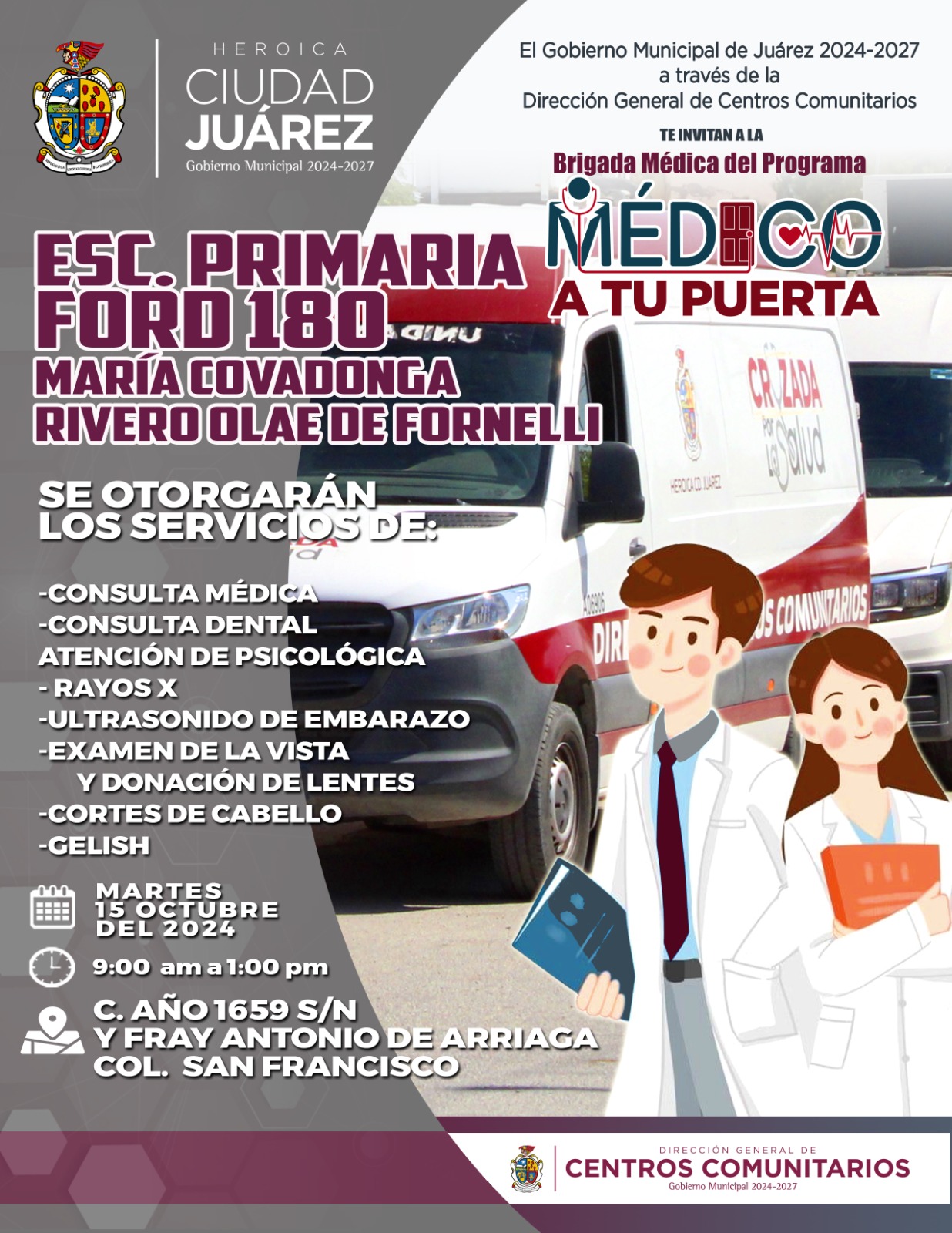 El Gobierno Municipal de Juárez, a través de la Dirección General de Centros Comunitarios, invita a la ciudadanía a participar en la brigada del Programa Médico a tu Puerta que se llevará a cabo en dos distintos puntos de la ciudad.