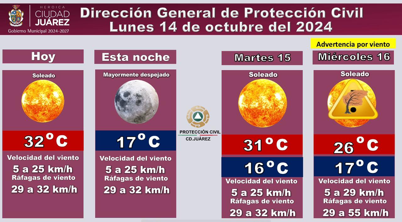 El pronóstico del clima para Ciudad Juárez, según la Dirección General de Protección Civil, indica temperaturas cálidas y vientos moderados a fuertes en los próximos días. A continuación, los detalles: