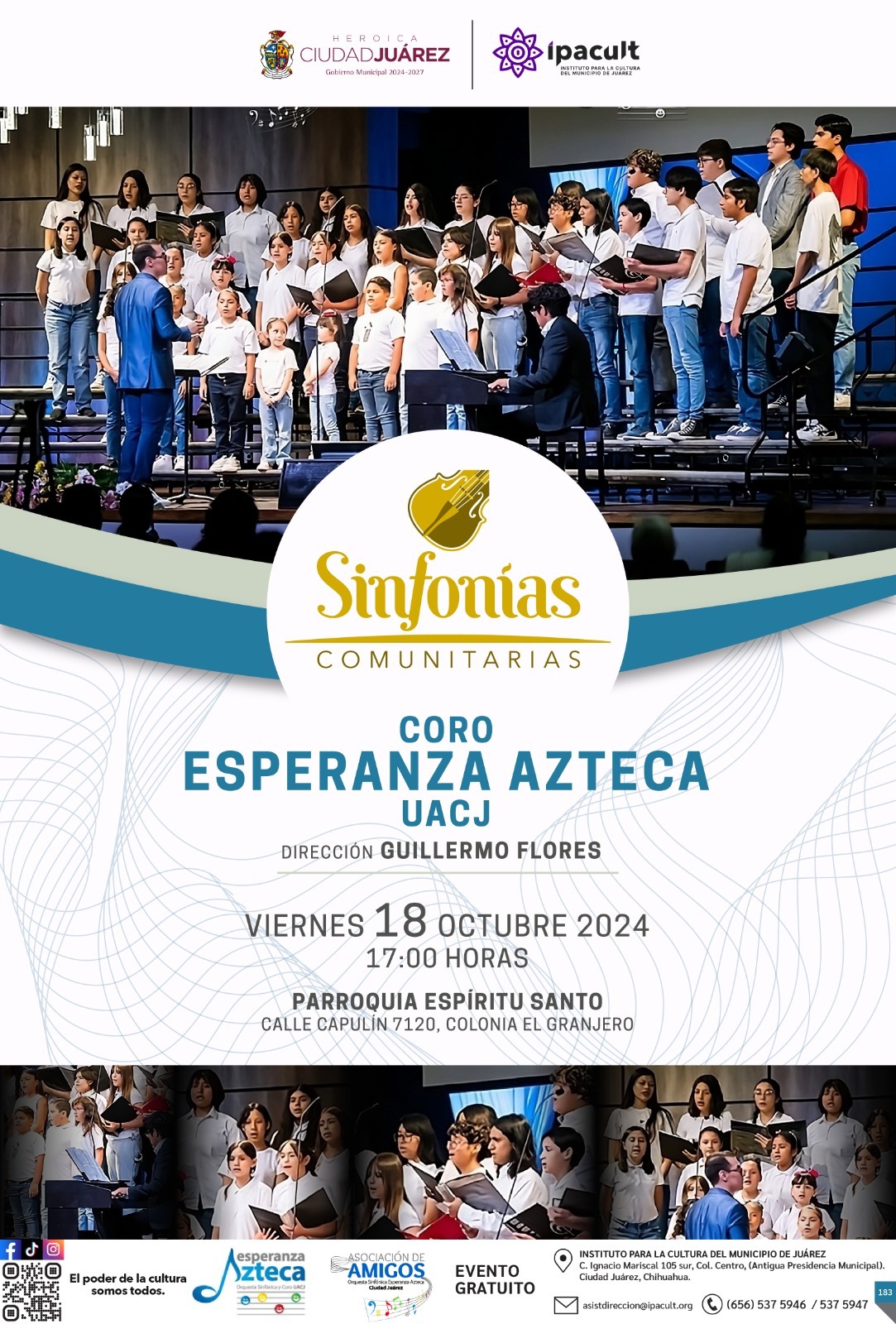 Como parte del programa Sinfonías Comunitarias, el Instituto para la Cultura del Municipio de Juárez (IPACULT) invita a la ciudadanía al concierto que ofrecerá el Coro Esperanza Azteca de la Universidad Autónoma de Ciudad Juárez (UACJ) el próximo viernes 18 de octubre.