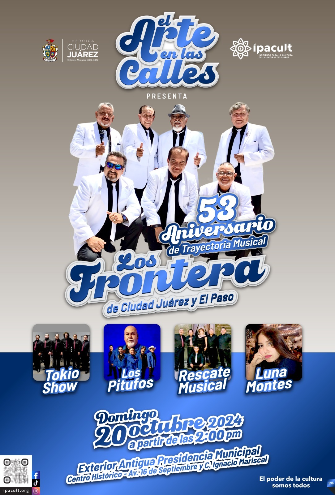 El Instituto para la Cultura del Municipio de Juárez (IPACULT) invita a la ciudadanía a participar en el evento “Arte en las Calles”, que se llevará a cabo el próximo domingo al exterior del Centro Municipal de las Artes (CMA), el cual servirá como marco para conmemorar el 53 aniversario del icónico grupo juarense “Los Frontera”.