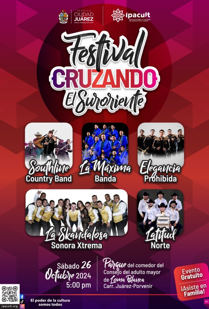El Instituto para la Cultura del Municipio de Juárez (IPACULT) extiende una invitación a la ciudadanía para participar en el Festival Cultural “Cruzando el Suroriente”, que se llevará a cabo el próximo sábado 26 de octubre en el Parque del Comedor del Consejo del Adulto Mayor de Loma Blanca.