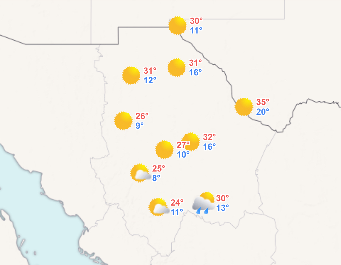 Durante la tarde, ambiente cálido. Viento de dirección variable de 15 a 30 km/h con rachas de 40 a 60 km/h.