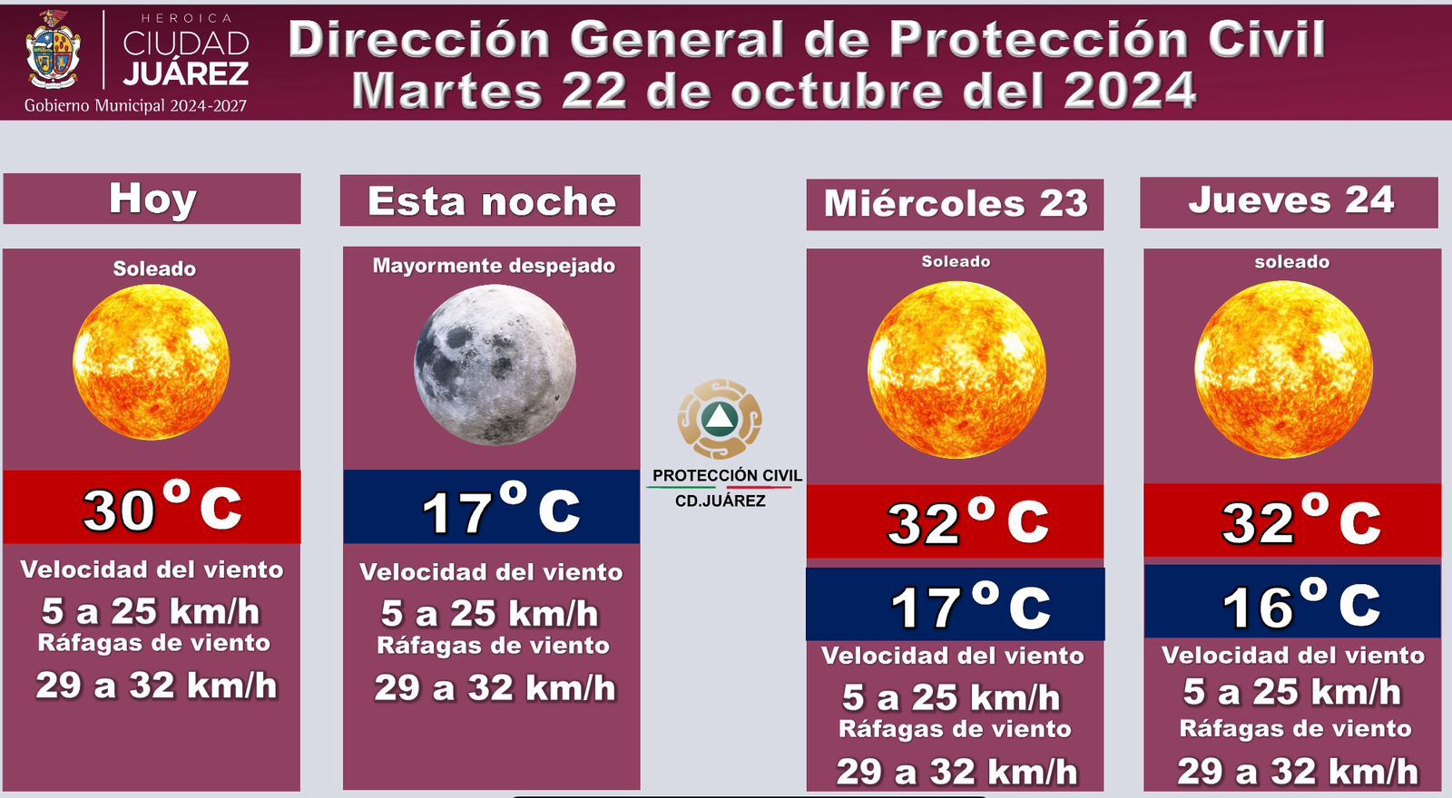 La Dirección General de Protección Civil de Ciudad Juárez dio a conocer el pronóstico del clima para hoy martes 22, así como para mañana miércoles y el jueves 24.