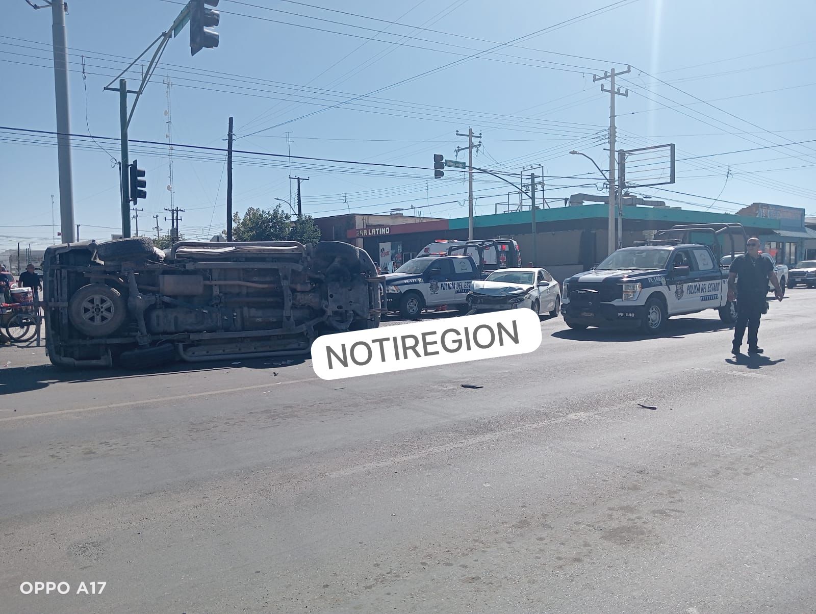 La mañana de este martes, aproximadamente a las 11:10 horas se registró un choque volcadura en el crucero de la Benito Juárez y Jesús Urueta, en el que una camioneta Pick Up Chevrolet terminó volcada sobre su costado izquierdo, mientras que un auto Chevrolet Cavalier 4 puertas color gris y con placas del estado de Chihuahua terminó con el frente afectado.