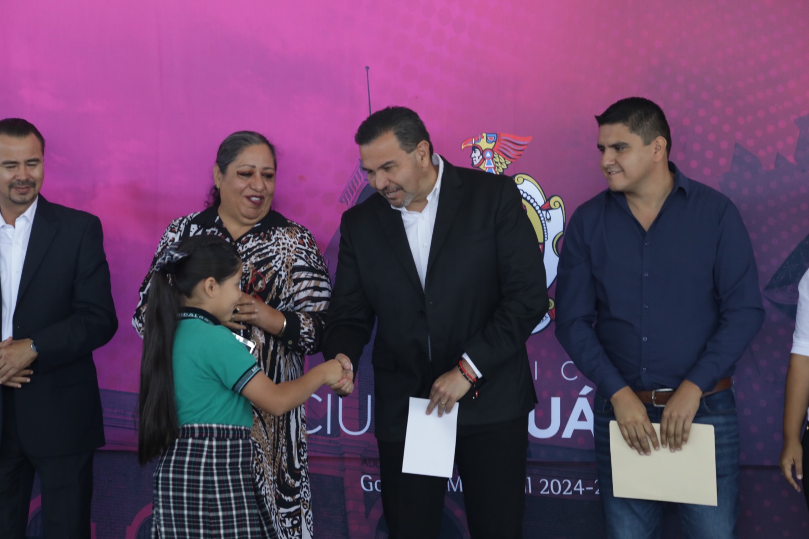Al evento también acudieron Karla Jurado, directora de la Escuela Miguel Hidalgo y Costilla; Jorge Marcial Bueno Quiroz, regidor y coordinador de la Comisión de Educación; Arturo Rivera, director general de Servicios Públicos Municipales; Ismael Rueda, director de Infraestructura Educativa y Guillermo Alvídrez Olivas, director de Educación Municipal.