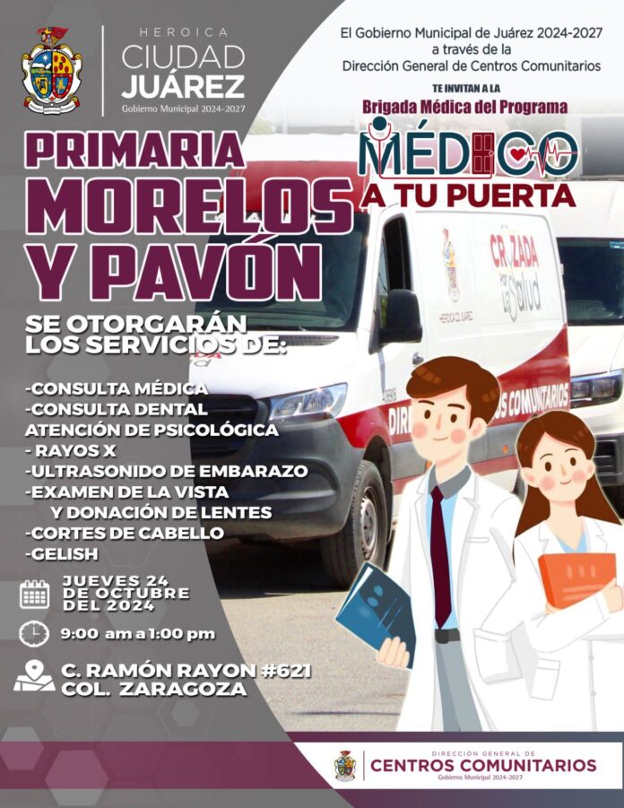El Gobierno Municipal de Juárez, a través de la Dirección General de Centros Comunitarios, invita a la comunidad a participar en la brigada del programa “Médico a tu Puerta”, que se llevará a cabo en la Escuela Primaria José María Morelos y Pavón, situada en la calle Ramón Rayón 621, en la colonia Zaragoza.