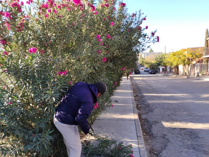 Empleados de la Dirección de Parques y Jardines dieron mantenimiento al área verde ubicada en el cruce de las calles Bario y Begonias, en la colonia Niños Héroes.