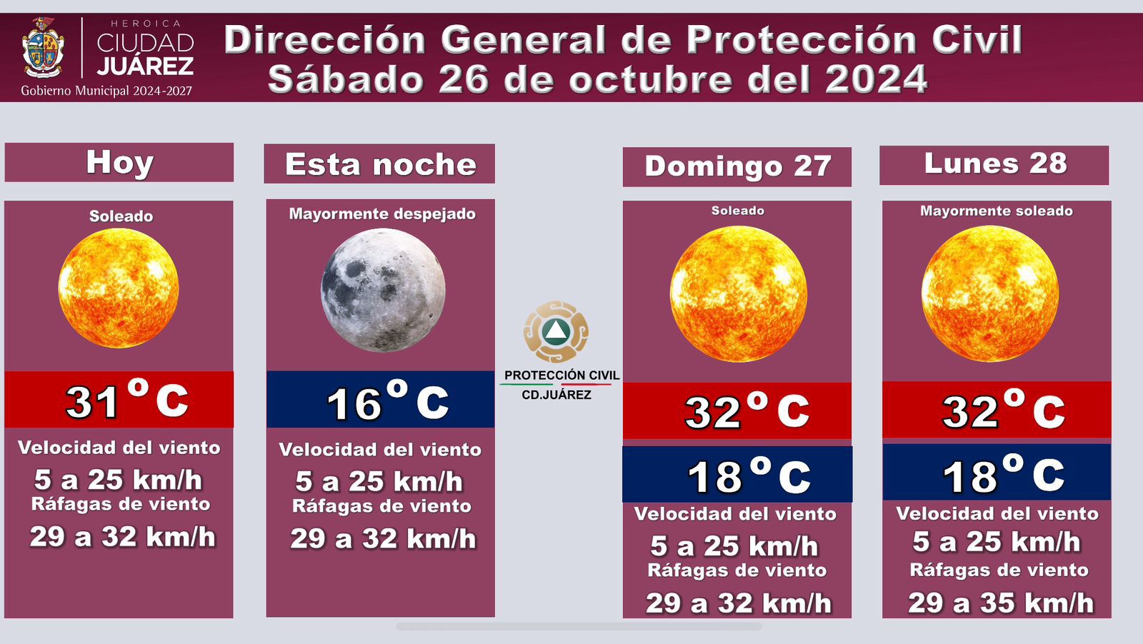 La Dirección General de Protección Civil de Ciudad Juárez informa el pronóstico del clima para los próximos días.
