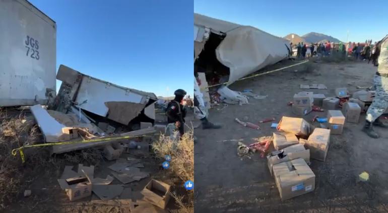 Esta mañana, en la carretera que une a Gómez Palacio a Jiménez, a la altura del kilómetro 219+000, se produjo un aparatoso accidente protagonizado por un tráiler de doble remolque que transportaba empaques de galletas.
