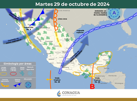 Para este martes, el frente frío número 6 sobre el noroeste y norte del país, en interacción con la corriente en chorro y una circulación anticiclónica en niveles medios de la atmósfera, favorecerán ambiente de fresco a templado por la mañana, de poco caluroso a caluroso por la tarde, temperaturas de frías a muy frías en la zona serrana, cielo de despejado a parcialmente nublado.