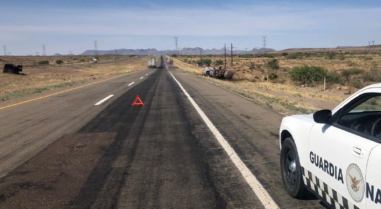 Esta mañana, en la carretera entre Ciudad Juárez y Chihuahua ocurrió un aparatoso accidente. Una camioneta con traila volcó cerca en el km 206, luego de perder el control, generando tráfico en la vía. La Guardia Nacional se encuentra en el lugar para retirar la unidad y desviar el tráfico.