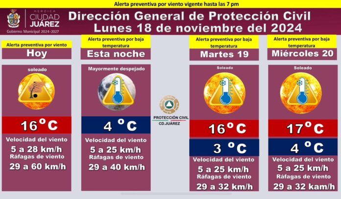 La Dirección General de Protección Civil de Ciudad Juárez ha emitido alertas preventivas por viento y bajas temperaturas para los próximos días, detallando el pronóstico meteorológico.