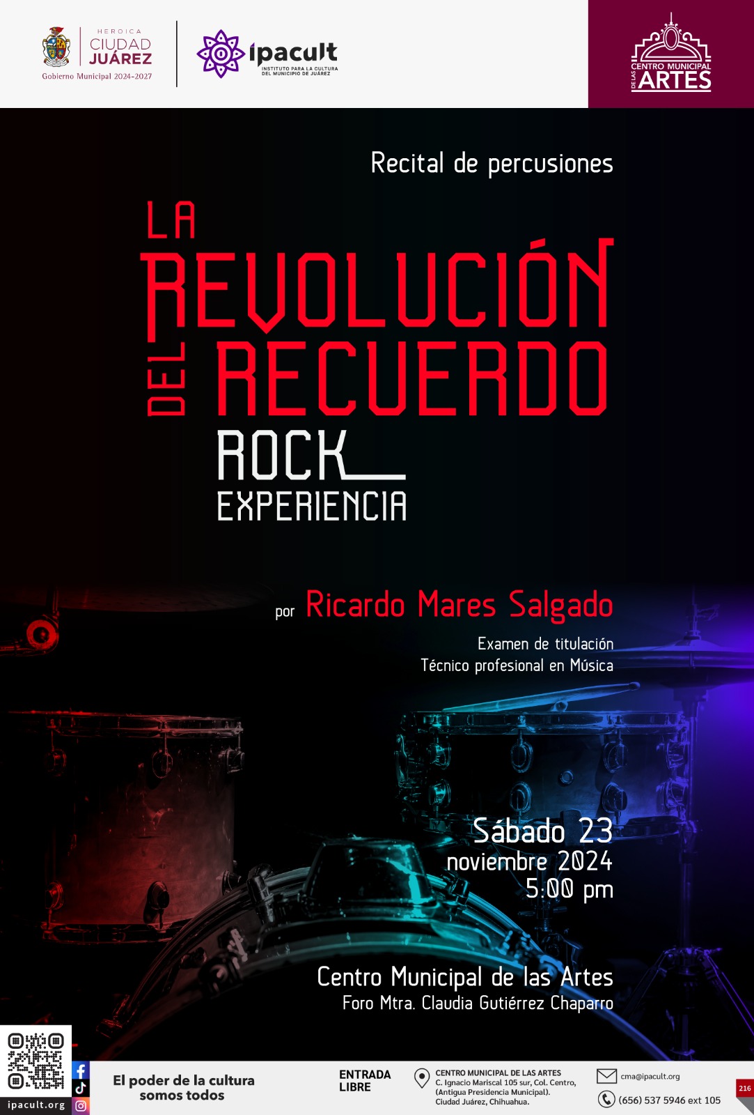 El Instituto para la Cultura del Municipio de Juárez (IPACULT) invita a la ciudadanía a asistir al recital de percusiones La Revolución del Recuerdo: Rock Experiencia, que se llevará a cabo este sábado 23 de noviembre a las 5:00 de la tarde en el foro Mtra. Claudia Gutiérrez Chaparro del Centro Municipal de las Artes (CMA).