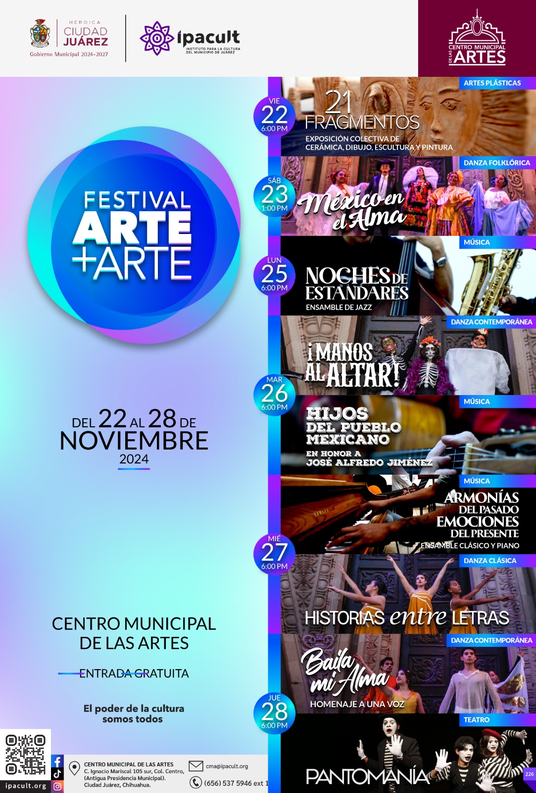 El Instituto para la Cultura del Municipio de Juárez (IPACULT) invita a la ciudadanía al Festival Arte+Arte, que se llevará a cabo del 22 al 28 de noviembre, evento que celebra el cierre de cursos de las diversas disciplinas impartidas en el Centro Municipal de las Artes (CMA) y contará con presentaciones artísticas de teatro, danza, música y artes plásticas a cargo de estudiantes de todas las carreras del instituto.