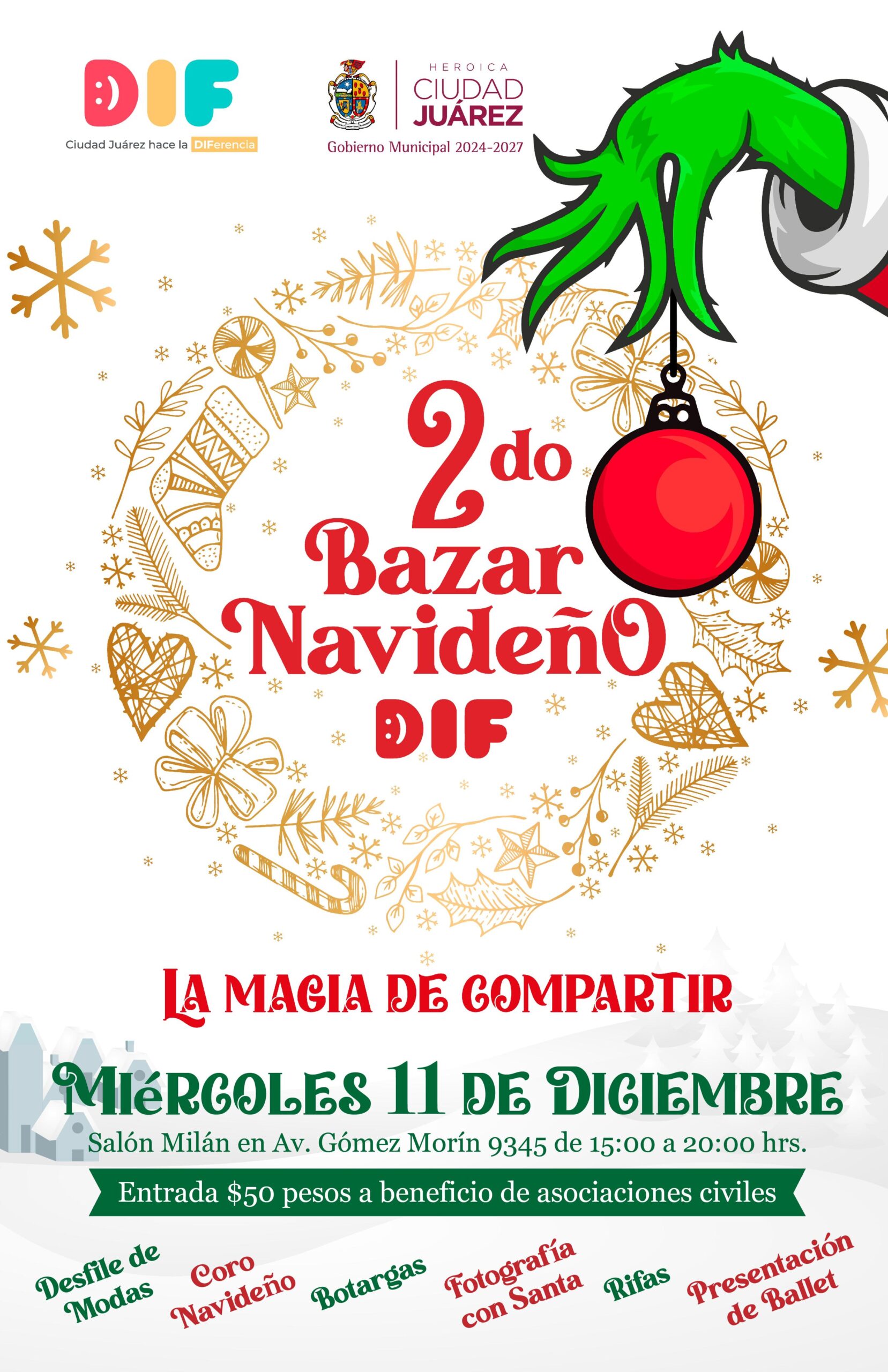 El Sistema para el Desarrollo Integral de la Familia del Municipio de Juárez (DIF), invita a la comunidad juarense al Segundo Bazar Navideño ‘La Magia de Compartir’, que se llevará a cabo el próximo 11 de diciembre en el salón Milán, con el objetivo de beneficiar a las organizaciones de la sociedad civil.