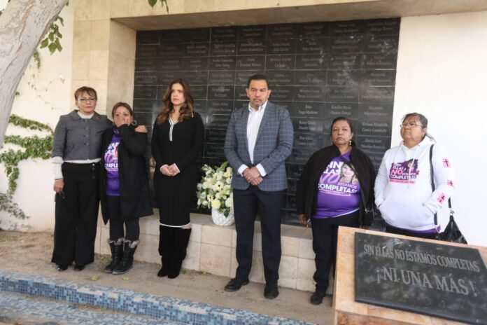 En el marco del Día Internacional de la Eliminación de la Violencia contra la Mujer, el Presidente Municipal, Cruz Pérez Cuéllar y su esposa la presidenta del DIF, Rubí Enríquez, depositaron una ofrenda floral en el Memorial a Víctimas de Feminicidio del Campo Algodonero.