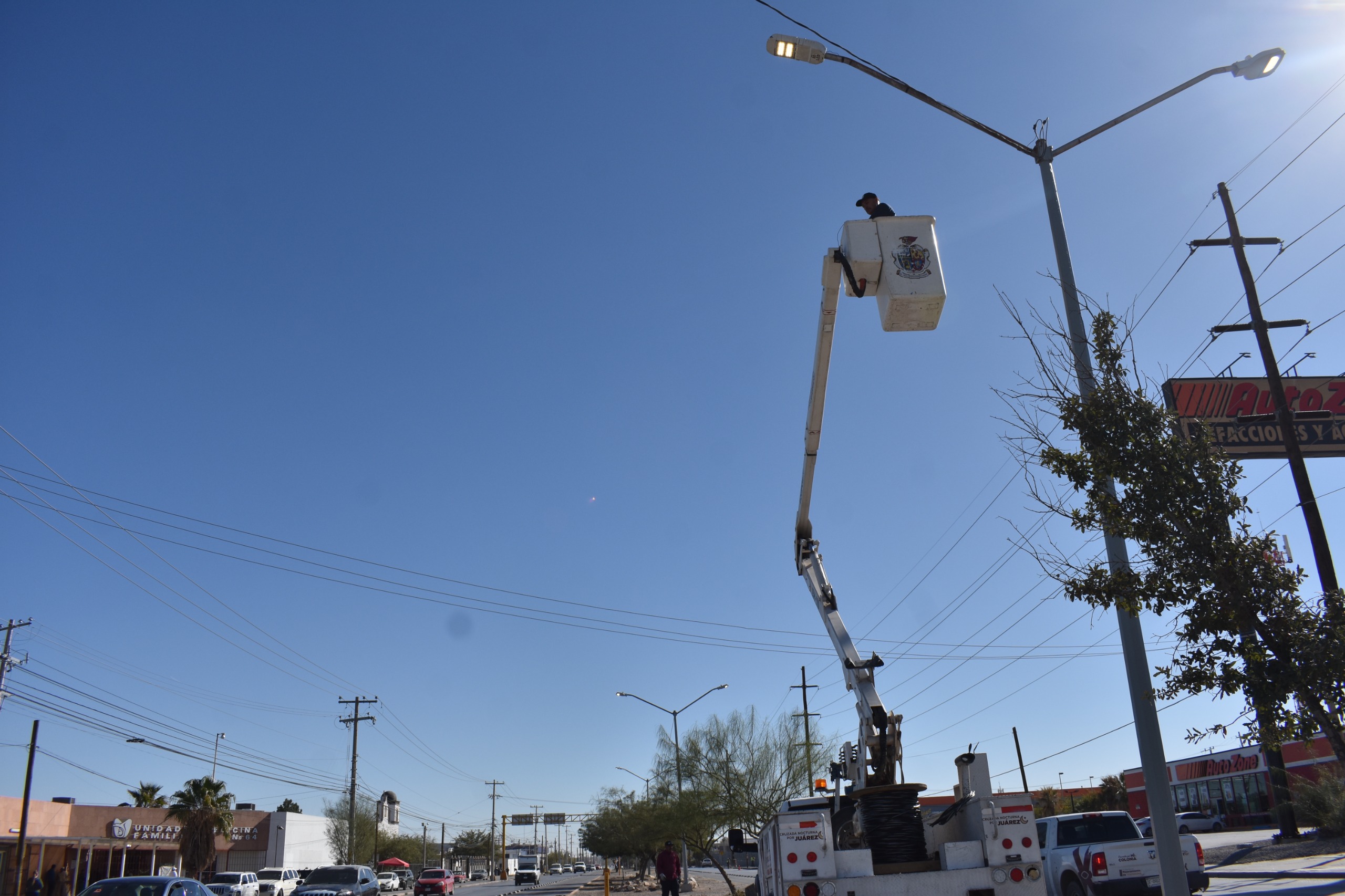 Personal operativo de la Dirección General de Servicios Públicos realiza desde este martes trabajos previos de limpieza y mantenimiento a luminarias en el bulevar Zaragoza, donde se llevará a cabo este miércoles a las 8:00 de la noche la sexta edición de la Cruzada Nocturna.