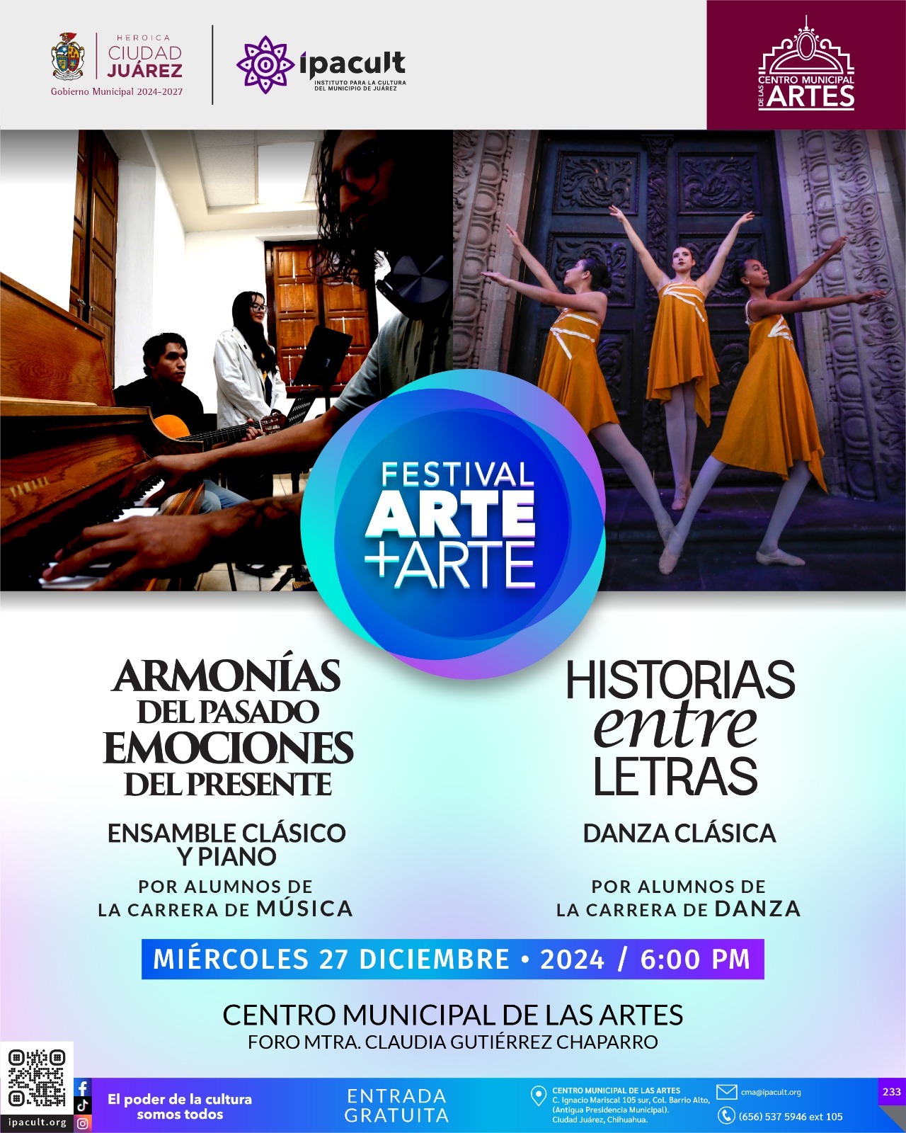 El Instituto para la Cultura del Municipio de Juárez (IPACULT) invita a toda la comunidad a disfrutar de una tarde de música y danza en el marco del Festival Arte+Arte, que se llevará a cabo este miércoles a las 6:00 de la tarde en el Centro Municipal de las Artes (CMA).