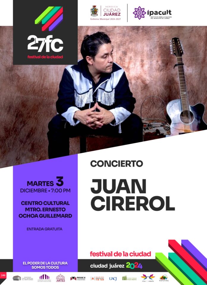 El Instituto para la Cultura del Municipio de Juárez (IPACULT) invita a la ciudadanía al concierto de Juan Cirerol que se llevará a cabo mañana martes 3 de diciembre a las 07:00 de la tarde, en el Centro Cultural Ernesto Ochoa Guillemard.