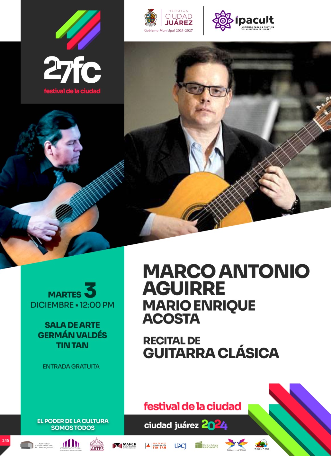 En el marco de la edición 27 del Festival de la Ciudad, el Instituto para la Cultura del Municipio de Juárez (IPACULT) invita a la ciudadanía al recital de guitarra clásica que ofrecerá Marco Antonio Aguirre este martes 03 de diciembre a las 12:00 del mediodía en la Sala de Arte German Valdés Tin Tan.