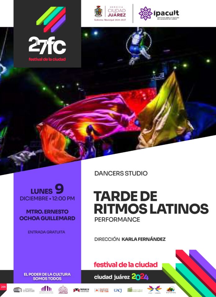 Como parte de las actividades de la edición 47 del Festival de la Ciudad, el Instituto para la Cultura del Municipio de Juárez (IPACULT) invita al performance “Tarde de ritmos latinos”, que se llevará a cabo este lunes 9 de diciembre de manera gratuita, a las 12:00 del mediodía en el Centro Cultural Ernesto Ochoa Guillemard.