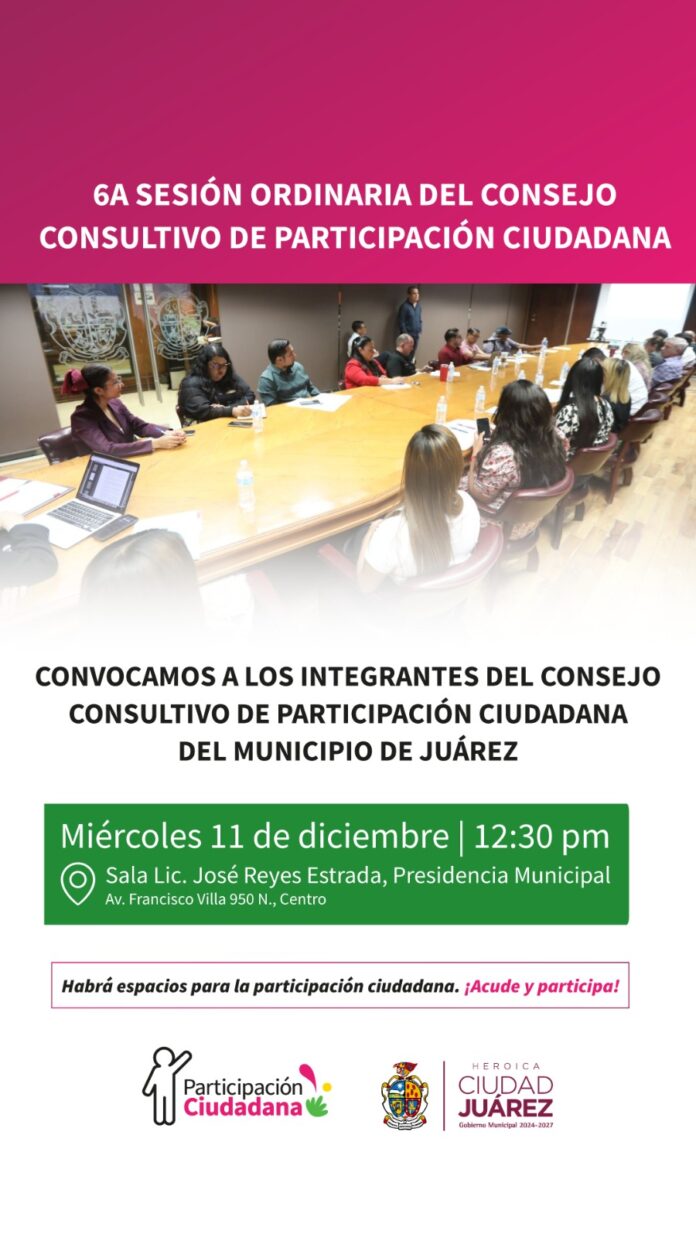 La Dirección de Participación Ciudadana invita a la comunidad juarense para que acuda a la sexta sesión ordinaria del Consejo Consultivo, mañana miércoles a las 12:30 horas.
